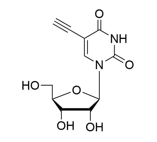 • 5-Ethynyl uridine (5-EU) is an alkyne-containing metabolic labeling reagent used to detect global RNA transcription temporally and spatially in both in-vitro and in-vivo with the modified nucleotide. The alkyne handler can be used for subsequent ligation to azide-containing molecules through a highly efficient click chemistry reaction.