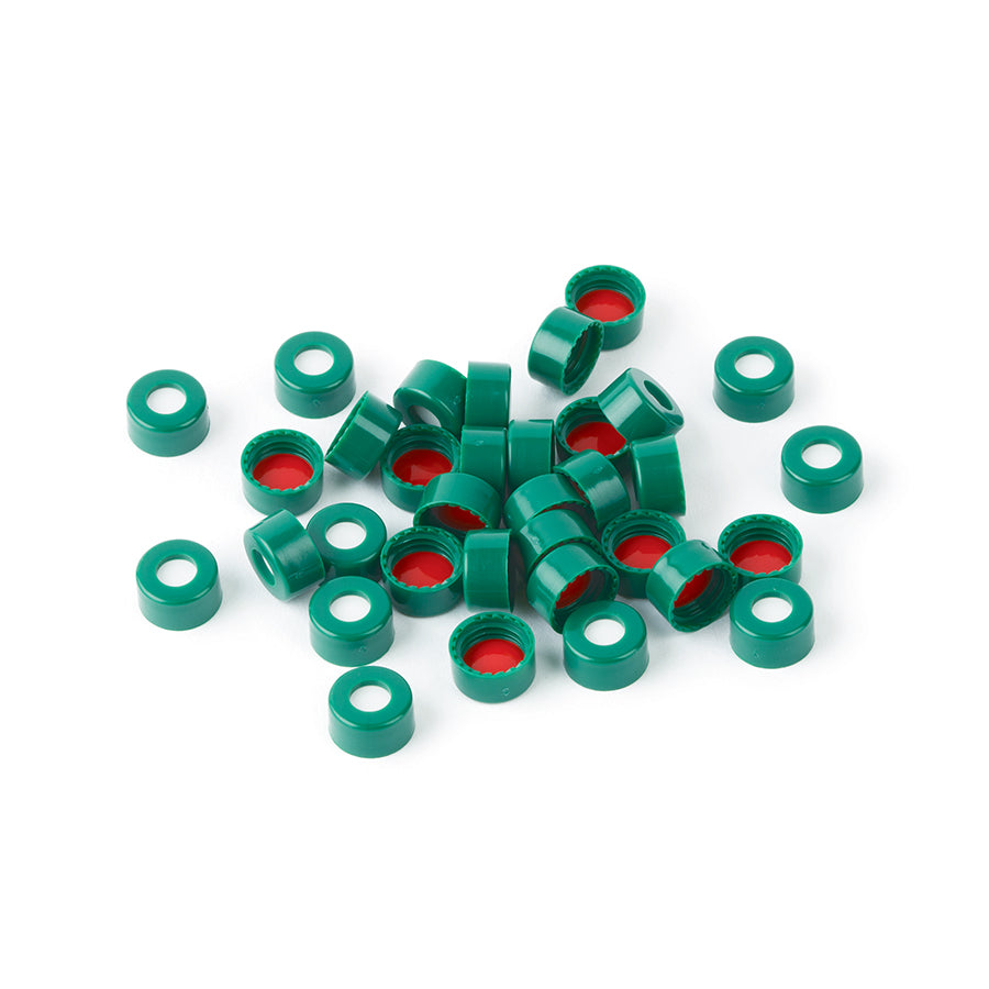 Caps, Short Screw, 9 mm, PTFE/Silicone Septa, Green, 100/pk