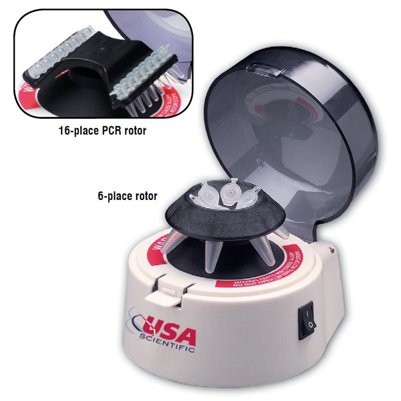 • Includes two interchangeable rotors: a 6-place rotor for 1.5 or 2.0 mL tubes and a 16-place rotor for 0.2 mL tubes. Measures 5 1/8" W x 5 7/8" D x 4 5/8" H. Two-year warranty.