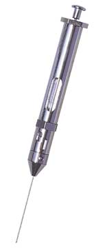 • The front end houses a special micro-volume annular needle with less than 0.5 µl dead volume and a positive mechanical Sample Lok valve to seal in volatile materials (up to 500 psi). The syringe volume is variable from 0.5 µl to 5.0 µl.