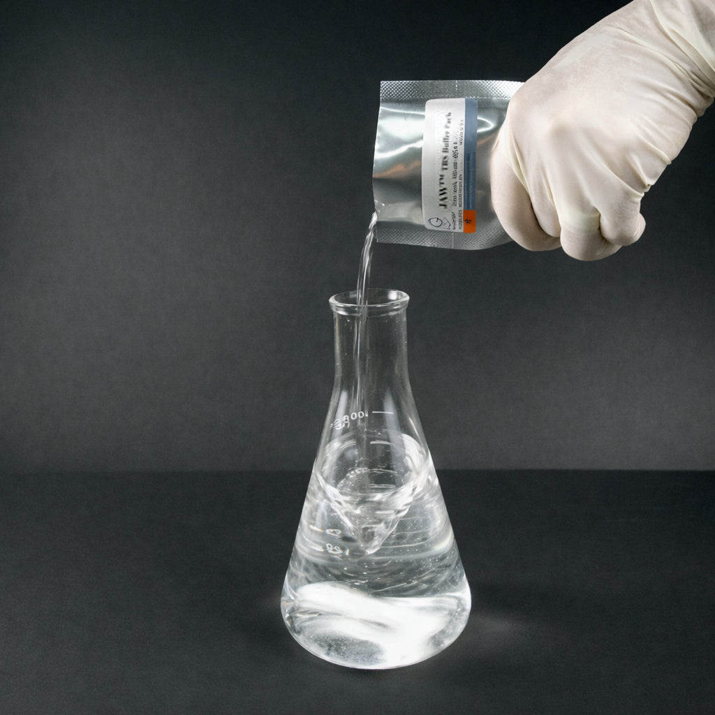 JAW™ Tris Buffered Saline with Tween 20 (TBST) Packs are ready to use dry-blend powder pouches designed to make 1X solution of TBS with 0.05% Tween 20. A novel spray drying technique allows for the inclusion of Tween 20 in the buffer pack. Just Add Water!