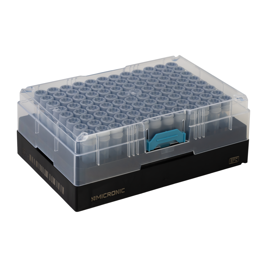 The Micronic EFC 96-3 Rack RM is 99% made of in-house renewed material. The Eco Rack is designed for 1.10ml internally or externally threaded tubes and 1.40ml internally or externally threaded tubes. The EFC 96-3 Rack RM is offered with a low cover for the 1.10ml tubes and a high cover for the 1.40ml tubes. The EFC 96-3 Rack RM is standard available with a 1D barcode and a human readable laser etched code on the side.