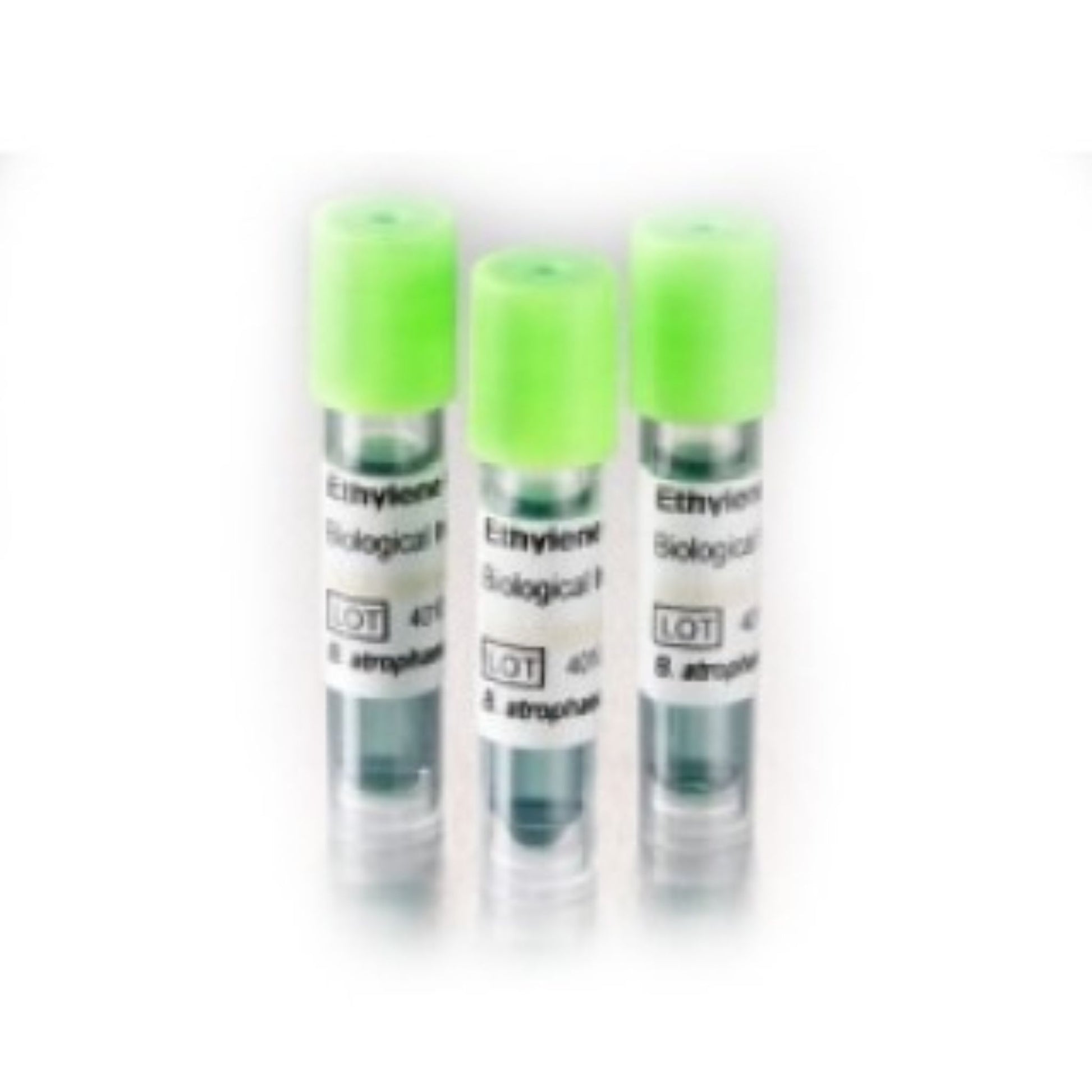 SporeView® Self-Contained Biological Indicators (SCBIs) for monitoring Ethylene Oxide (EO) sterilization consist of a thermoplastic vial and a green cap, a crushable glass ampule with an exclusively formulated Trypticase® Soy Broth (TSB) modified with pH indicator, and a disc inoculated with Bacillus atrophaeus spores.