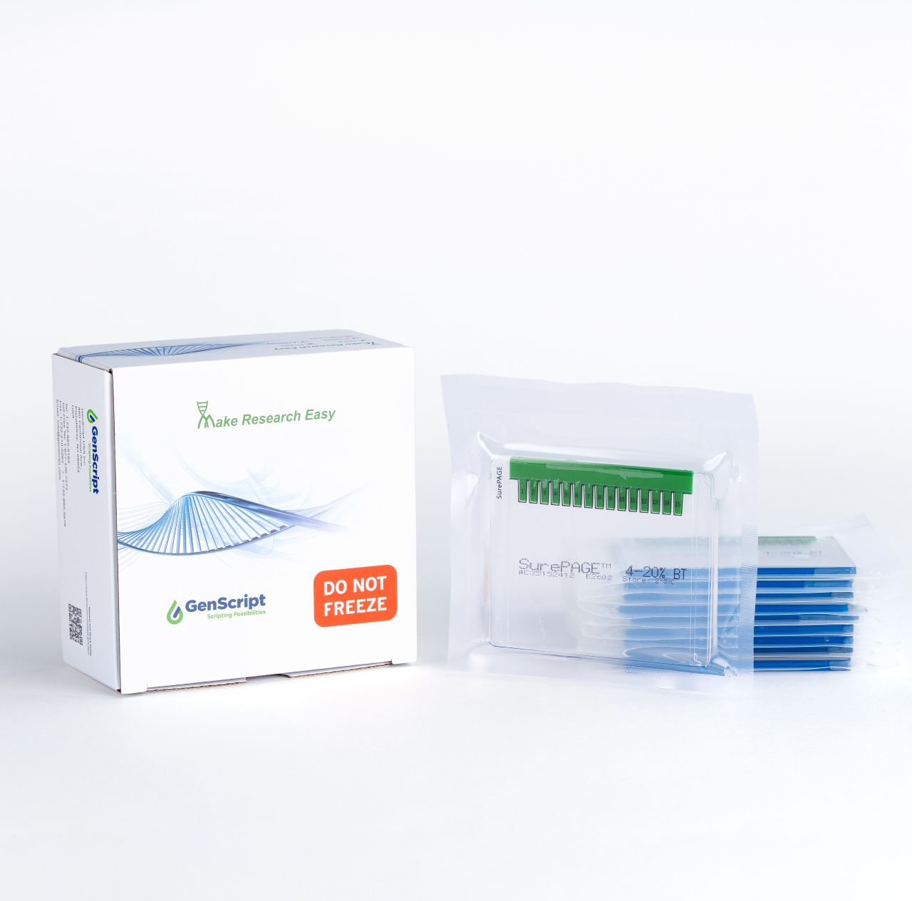 GenScript SurePAGE, Bis-Tris, 10 cm x 8 cm gels are high-performance precast mini polyacrylamide gels with a special design that allows large sample loading volumes. The unique formulation of the gel and cassette design enables superior band resolution and significantly improved band evenness. SurePAGE gels are cast in a neutral pH buffer that minimizes polyacrylamide hydrolysis, increases gel stability and minimizes protein modification.