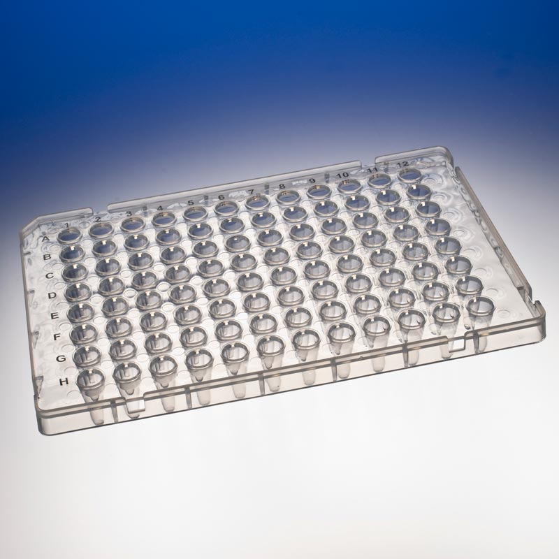 TempPlate® Semi-Skirted Polypropylene 0.1 mL 96-Well PCR Plate, Low Profile, Straight Sides with Raised Walls, Natural. Two/Sleeve, 10/Box.