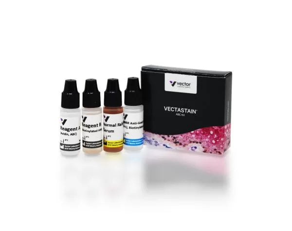 VECTASTAIN ABC-HRP Kit, Peroxidase (Goat IgG ), 1 Kit. The VECTASTAIN ABC Reagent can be used to detect any biotinylated molecule. This is the original avidin/biotin ABC complex formation with biotinylated anti-goat IgG secondary antibody. Features good sensitivity and low background. Kit contains sufficient reagents to stain approximately 1000–2000 sections. Kit Contents: 2 ml Reagent A, 2 ml Reagent B, 1 ml biotinylated rabbit anti-goat IgG, 3 ml normal rabbit serum.