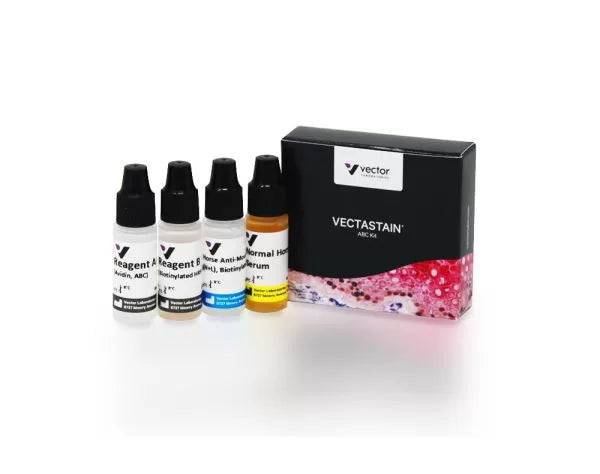 VECTASTAIN ABC-HRP Kit, Peroxidase (Mouse IgG ), 1 Kit. The VECTASTAIN ABC Reagent can be used to detect any biotinylated molecule. This is the original avidin/biotin ABC complex formation with biotinylated anti-mouse IgG secondary antibody. Features good sensitivity and low background. Kit contains sufficient reagents to stain approximately 1000–2000 sections. Kit Contents: 2 ml Reagent A, 2 ml Reagent B, 1 ml biotinylated horse anti-mouse IgG, 3 ml normal horse serum.